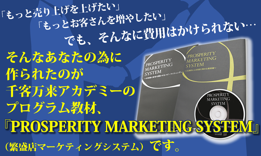 PROSPERITY MARKETING SYSTEMとは、「なんとか自分のお店を良くしたいが、そこまで費用がかけられる状況ではない」という方が、まずは自力でお客さんを増やし、売上げをアップさせるために必要な役割を果たすプログラム教材です。